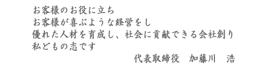 適正利潤を獲得し、地域社会から信頼され開かれた透明性のある会社をめざすと共に、社会に貢献してまいります。